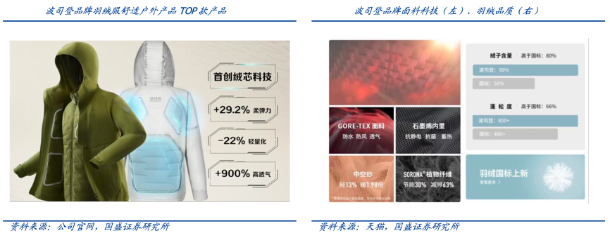 经典案例:根据公司官网、天猫、国盛证券研究所等综合资讯表明,截至 2023/3/31,波司登公司累计全部专利达 606 项,为专业性能与时尚流行兼备的款 式研发提供坚实基础。在坚实技术积淀的基础上,公司坚持迭代主打专业性能的“登峰”系列,在保暖性方面占领消费者心智、强化品牌专业属性。
