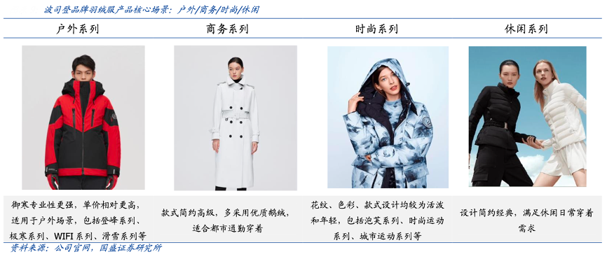 经典案例:根据公司官网、国盛证券研究所等综合资讯表明,作为羽绒服品类龙头品牌,波司登公司主品牌围绕不同的穿着场景(商务、户外、时尚、休闲)、不同人群需求特征,持续迭代推出丰富的产品,包括户外场景下的极寒系列、滑雪系列,时尚场景下的泡芙系列、时尚运动系列,商务场景下的风衣羽绒服系列等。