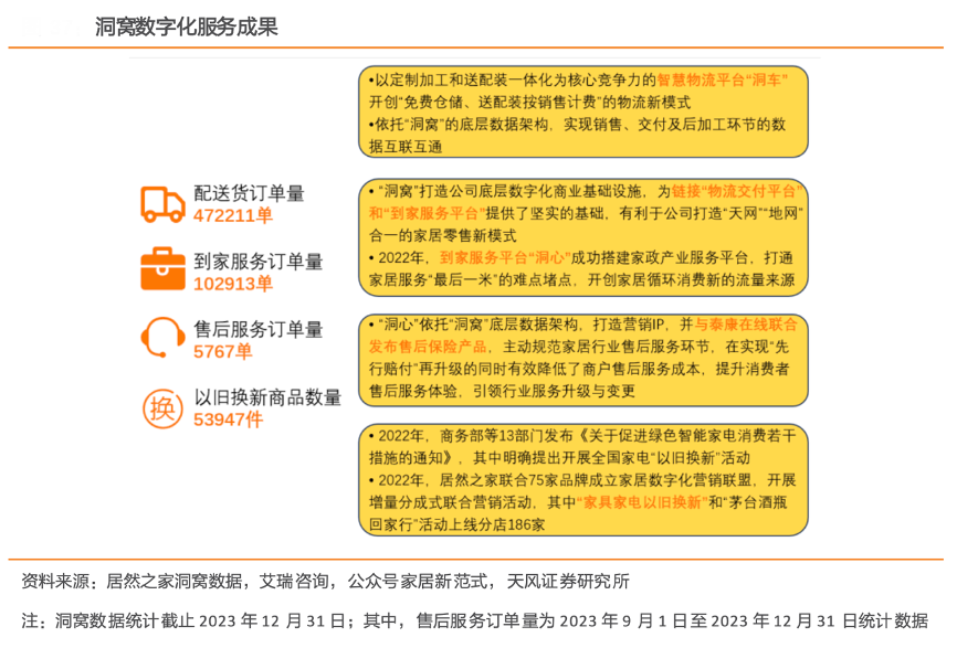 经典案例:根据公司年报、天风证券研究所等综合资讯表明,2000年居然之家公司率先提出“先行赔付”的服务理念,后续依次推出“绿色环保”、“一个月内无理由退换货”、“装修 零增项 ”、“终 身维保 ”等一系列服务承诺; 2023 年围绕“家具家电以旧换新”、“家有困难找居然”、“旧房换新颜”三大营 销 IP,为消费者提供更多可选权益方案。