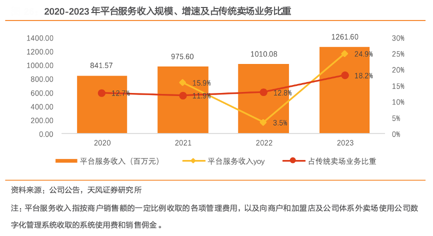 经典案例:根据公司公告、天风证券研究所等综合资讯表明,居然之家公司率先在家居行业内开展数字化转型,已完成“洞窝”、“居然设计家”和“居然智慧家”三大家居产业数智化平台的建设,共同推进公司成为实体商业数智化转型升级样板战略目标的实现。2020-2023 年公司平台服务收入从 8.4 亿 元提升至 12.6 亿元,CAGR 为 14.4%,且在传统卖场业务中占比持续提升。