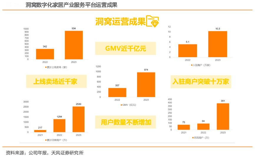 经典案例:根据公司年报、天风证券研究所等综合资讯表明,洞窝是家装家居数字化产业服务平台。成立于2020 年12月,依托居然之家的产业背景 和平台资 源打造 ,通过 聚焦产 业链上 下游的 数字化 赋能、线 上线下 一体化 全场景 零售、 跨 境电商三大核心业务,全链路赋能品 牌工厂 、经销 商和卖 场。截至 2023 年底洞窝累计上线卖场已达 934 家,同比增长 173.1%;入驻商户超过 10 万家, 同比增长 101.33%。