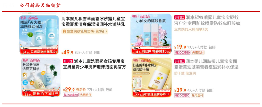 经典案例:根据华西证券等综合资讯表明,润本股份公司在自研自产自销战略下,全面触达原料供应商和 C 端消费者,通过与消费者深度互动,可精准制定以消费者喜好为导向的产品开发和营销策略。2023 年内,公司紧跟市场风向,推出了 50 余款新产品,其中主推新品积雪草冰沙霜、白桃乌龙驱蚊香氛、儿童和青少年洁面泡泡、蛋黄油面霜棒等,天猫平台上均达数万销量。