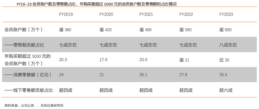经典案例:根据公司公告、天风证券研究所等综合资讯表明,江南布衣精心设计的会员制度提升了消费者体验,为品牌提供深入的市场洞察,指导产品迭代,促进社群建设,更好传达品牌价值观。FY19-23,公司会员账户数由逾 360 万个 增长到逾 690 万个,零售额贡献占比增长至八成左右;年购买额超过 5000 元的会员账户 数由 20.3 万个增长到近 26 万个。