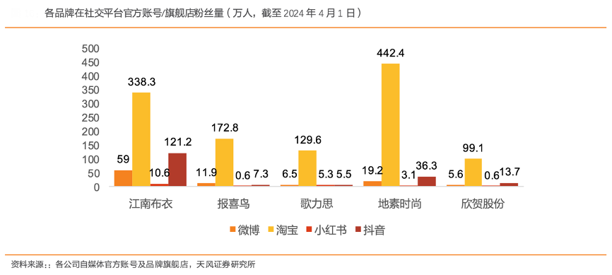 经典案例:根据各公司自媒体官方帐号及品牌旗舰店、天风证券研究所等综合资讯表明,江南布衣公司持续优化以粉丝为核心的全域零售网络的建设,公司 各大社交平台官方账号和旗舰店粉丝数都在同业企业中位居前茅。截至 2024 年上半年财年,江南布衣在各大社 交平台上的粉丝量累计超过 850 万。