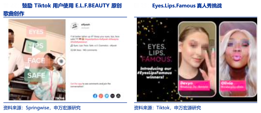 经典案例:根据Springwise、Tiktok、申万宏源研究等综合资讯表明,2019 年,TikTok 成为最热门的新 平台,但参与其中的美妆品牌却寥寥无几。E.L.F. BEAUTY 发现空白新渠道,并在 Tiktok 上发布原创品牌歌曲,鼓励用户使用带#EyesLipsFace 的背景音乐进行创作,收获首批 Z 世代消费客群。公司紧接着发起 TikTok 真人秀挑战 #EyesLipsFamous,以 TikTok 顶级 影响者、专业化妆师等的指导及为期一个月的“美容营”作为奖励,号召用户分享加入, 此次挑战收获了 3.8 亿浏览量,品牌粉丝数量激增 57%。