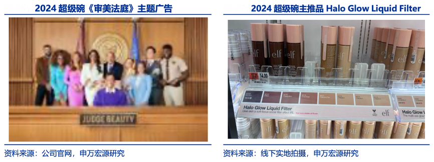 经典案例:根据公司官网、线下实地拍摄、申万宏源研究等综合资讯表明,传统媒介上,E.L.F. BEAUTY 选择美妆品牌少有涉及的超级碗,打造年度爆品底妆。公司抓住超级 碗带来的巨大曝光优势,携手演员 Jennifer Coolidge 拍摄底妆产品 Power Grip Primer 广告,取得观众的积极响应。2024 年,公司继续沿用超级碗流量,以审美法庭(Judge Beauty) 作为主题,邀请演员 Gina Torres、Rick Hoffman、Sarah Rafferty 等多位明星,打造 Halo Glow Liquid Filter 爆品。