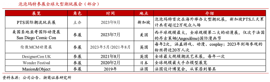 经典案例:根据公司公告、浙商证券研究所等综合资讯表明,为提高世界知名度和曝光率,泡泡玛特积极参加境外潮玩展;除参展外,2023 年 9 月泡泡玛特在新加坡举行 PTS 国际潮流玩具展,此为公司首次在境外举办大型潮玩展,来自世界各地的 90 多名风格各异的艺术家的作品参展,三天累计共有超过 2 万观众入场。