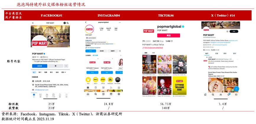 经典案例:根据Facebook、Instagram、Tiktok、X(Twitter)、浙商证券研究所等综合资讯表明,泡泡玛特出海在逐步打造 IP 全球影响力,其已在数个全球用户量 TOP15 平台中开设账号,社交媒体粉丝数量累计超百万,TIKTOK 上, 带有#popmart 标签的视频总播放量接近 10 亿,在 Instagram 上,带有#popmart 等相关标签的帖子有 50 余万条。