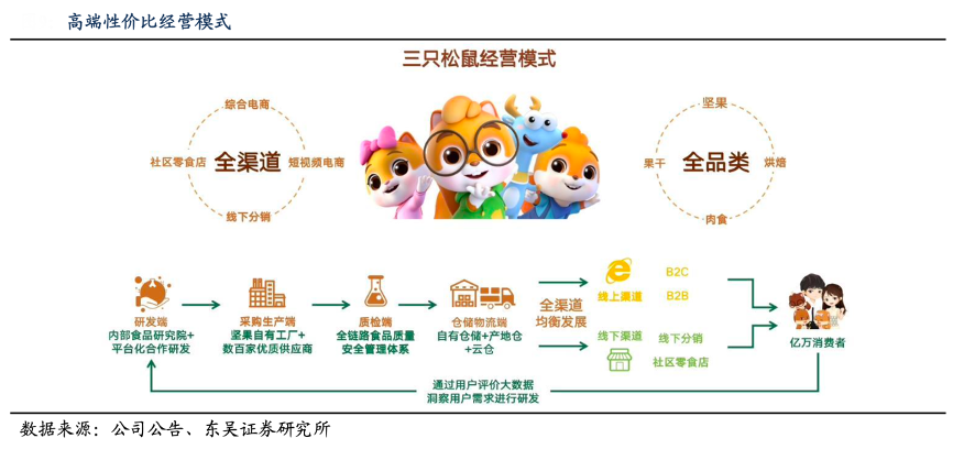 经典案例:根据公司公告、东吴证券研究所等综合资讯表明,三只松鼠公司提出“高端性价比”战略,其强调以新市场需求为导向、以消费 者为核心,通过对整个产业链和关键要素的深度整合和优化,实现“链路更短、工具更 先进、组织更协同”。