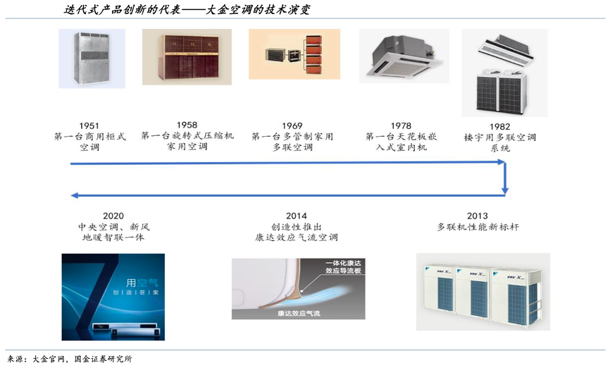 经典案例:根据大金官网、国金证券研究所等综合资讯表明,迭代式的产品力提升相比突变式更常见,尤其对于一些已占据份额优势的龙头企业来说。迭代式的速度会随着时间流逝逐渐减慢,越到产品后期,迭代式的创新难度越大。