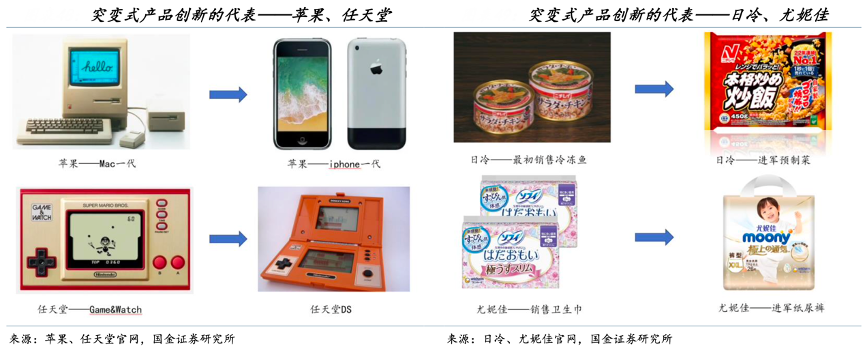 经典案例:根据任天堂官网、苹果、日冷、尤妮佳官网、国金证券研究所等综合资讯表明,卓越的公司在旧的产品生命力进入中后期后,有能力通过下一个重大突变式创新,为公司的增长打开新的引擎。比如:苹果推出 iPhone、任天堂推出 DS、尤妮佳进军纸尿裤市场推出“Moony”品牌、日冷推出“正宗炒饭”。