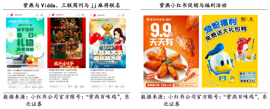 经典案例:根据小红书公司官方帐号:“紫燕百味鸡”、东北证券等综合资讯表明,紫燕食品公司在社交媒体营销方面逐渐成熟且有着绝对的领先,而年轻群体在社交媒体用户占多数,有助于公司在该群体打开知名度,稳定未来客源。 为了进一步推动品牌宣传,公司与 Vidda、jj 麻将、三联周刊等第三方品牌联名合作,同时参与直播卖货,在线上平台进行各大促销与福利活动。