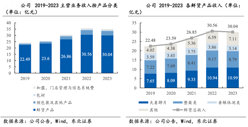 经典案例:根据公司公告、wind、东北证券等综合资讯表明,紫燕食品公司以塑造“大单品”与“爆品”为目标,推出多种新品,如:酸汤肥牛、冷吃千层肚、乐山钵钵鸡、藤椒板鸭等。鲜货产品的 2019/2020/2021/2022/2023 年的营业收入为 22.49/23.60/26.86/30.56/ 30.04 亿 元,CAGR 为+7.52%,由 22.49 亿元涨至 30.04 亿元,上涨幅度基本与公司主营收入 呈正比。