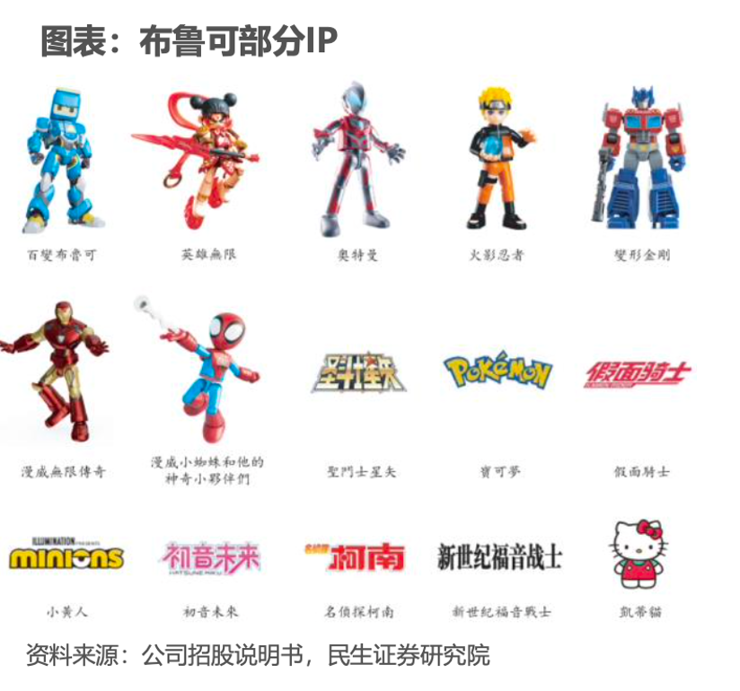经典案例:根据公司招股说明书、民生证券研究院等综合资讯表明,自成立之初,布鲁可已通过自有及授权积累了丰富的IP矩阵。成功打造自有IP并商业化自有IP和授权IP的出色业绩,使布鲁可成为IP版 权方优选的合作伙伴。布鲁可的IP数量从2021年12月31日的9个增加至超过30个。