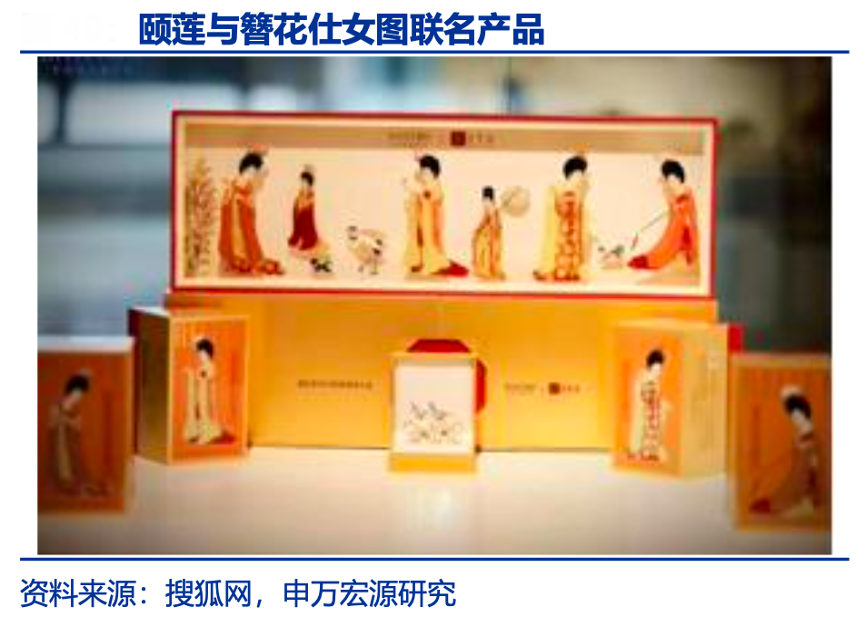 经典案例:根据搜狐网、申万宏源研究等综合资讯表明,颐莲将产品功效与品牌审美和文化内涵 相结合,品牌与《颐和仙境》、荣宝斋《簪花仕女图》等文化项目合作,传递东方美学特征和品牌文化。2023 年,颐莲与千年瓷都景德镇携手打造了第一款私模产品——安肌精华,将品牌 20 年国货品牌的文化底蕴与景德镇的匠心精神巧妙融合。