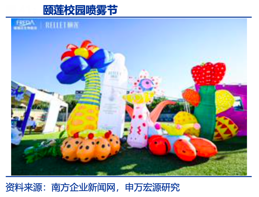 经典案例:根据南方企业新闻网、申万宏源研究等综合资讯表明,颐莲品牌更加关注建立与 年轻消费者之间的长期互动,结合颐莲补水喷雾特点打造校园音乐喷雾节,让年轻消费者 直接体悟到颐莲带来的清爽。