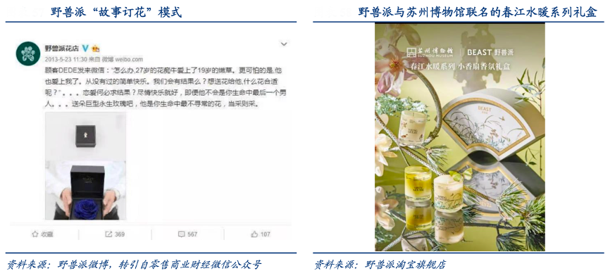经典案例:根据野兽派微博、转引自零售商业财经微信公众号、野兽派淘宝旗舰店、华创证券等综合资讯表明,野兽派 2011 年底诞生于微博,早期以卖花为主营,“故事订花”模式(根据网友私信所 讲述的故事来定制不同的花束,并赋予浪漫命名,为订花者量身打造专属产品) 售卖产 品之余,提供更多情绪价值,让消费者心甘情愿为高溢价买单。