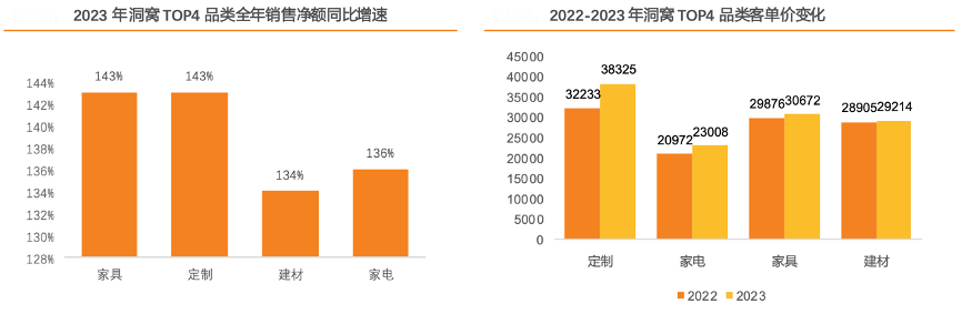 经典案例:根据公司年报、天风证券研究所等综合资讯表明, 2022-2023 年洞窝整体销售净额从 346 亿元提升至 974 亿元,主要得益于洞窝广泛渗透以及用户规模和商品丰富度快速提升。拆分量价来看,2022-2023 年洞窝客单价从 3.7 万元提升至 4.1 万元、客单量从 2.4 单提升 至 2.6 单,均增长约 10%,主要系凭借线上线下相结合的新购物场景带来了服务体验升级。