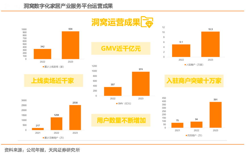 经典案例:根据居然之家洞窝数据、艾瑞咨询、公众号家居新范式、天风证券研究所等综合资讯表明,洞窝成立于2020 年12月,依托居然之家的产业背景 和平台资源打造 ,通过聚焦产 业链上 下游的 数字化 赋能、线 上线下 一体化 全场景 零售、跨 境电商三大核心业务,全链路赋能品 牌工厂 、经销 商和卖场。截至 2023 年底洞窝累计上线卖场已达 934 家,同比增长 173.1%;入驻商户超过 10 万家。
