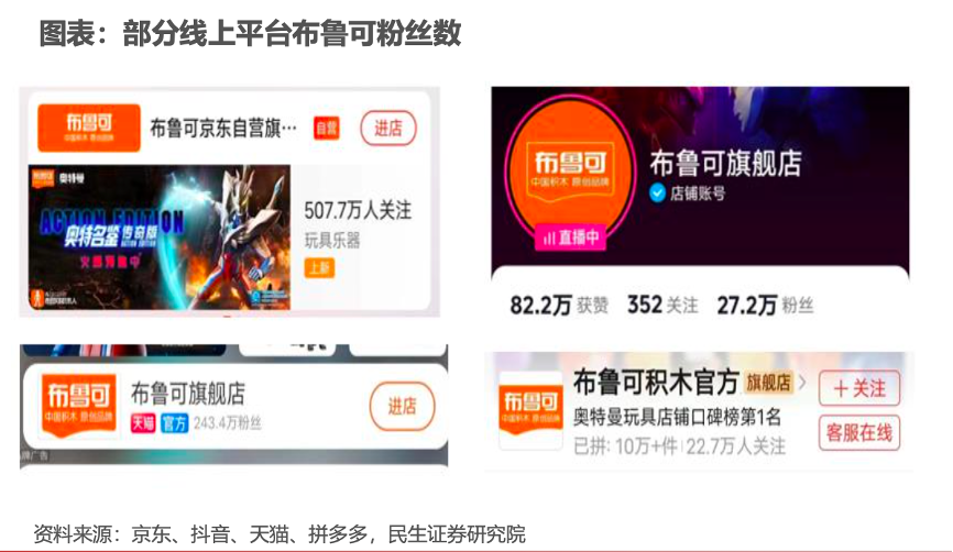 经典案例:根据京东、抖音、天猫、拼多多、民生证券研究院等综合资讯表明,通过内容驱动的互联网营销策略以及全渠道的销售网络,布鲁可实现了良好的营销和销售效果。在京东、微信、天猫、抖音、拼多多、快手、微博、小红书、哔哩哔哩等线上平台共拥有超过1,100万粉丝,是位列中国玩具企业前二的品牌。