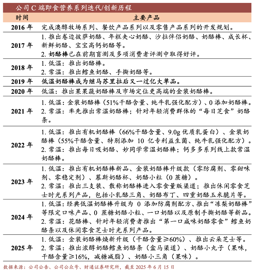 经典案例:根据公司公告、公司公众号、财通证券研究所等综合资讯表明,妙可蓝多公司依托业内领先的研发能力,实现奶酪产品的持续迭代升级。自 2018 年低温奶酪棒上市以来,公司针对奶酪棒的口味、营养、干酪含量等各维度不断迭代升级,陆续推出了零添加金装奶酪棒、高钙奶酪棒、奇炫奶酪棒等升级品类,并于 2021 年推出常温奶酪棒,拓宽了奶酪棒产品的渠道和消费场景。