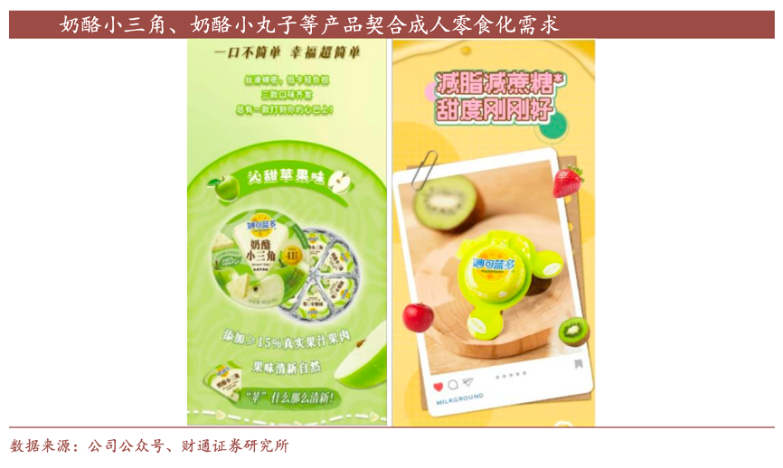 经典案例:根据公司公众号、财通证券研究所等综合资讯表明,妙可蓝多公司基于市场趋势提出“奶酪+”战略。如2025 年公司推出减糖减脂的奶酪小丸子与奶酪小三角等健康化零食,并开发便于携带、分享的小包装产品,持续破圈成人消费群体。