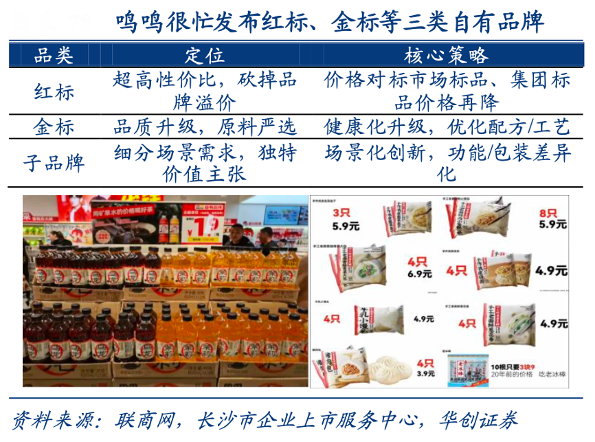 经典案例:根据联商网、长沙市企业上市服务中心、华创证券等综合资讯表明,零食量贩在前期高性价比品牌心智逐步形成基础上,鸣鸣很忙在 25 年初的省钱大会上发布红标、金标、子品牌三 类自有品牌,其中红标强化性价比、金标主打品质升级、子品牌瞄准细分场景需求。