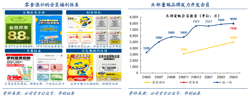 经典案例:根据公司官方公众号、华创证券等综合资讯表明,2023 年左右零食很忙、好想来均开拓会员体系,配套以各类会员活动及福利,开拓客群并强 化会员粘性,头部企业会员数快速攀升,且鸣鸣很忙 1.2 亿个、好想来 7900 万个会员, 大幅领先中小品牌不足 2000 万会员的水平。此外,量贩品牌逐步开拓开辟直播、线上商 城/外卖、团购等业务,试水拓宽业务边界。