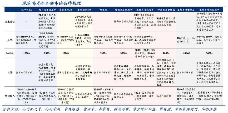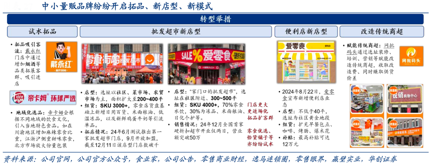经典案例:根据公司官网、公司官方公众号、食业家、公司公告、零售商业财经、逸马连锁圈、零售眼界、赢壁实业、华创证券等综合资讯表明,中小量贩品牌纷纷开启拓品、新店型、新模式。