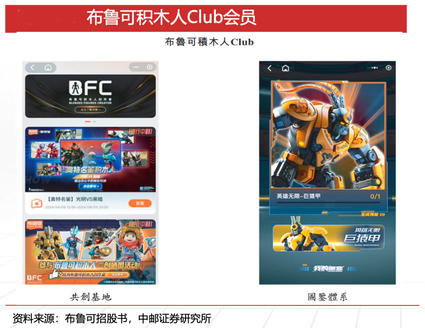 经典案例:根据布鲁可招股书、中邮证券研究所等综合资讯表明,布鲁可公司设立多渠道会员计划,包括微信小程序布鲁可积木人Club和各大电商平台旗舰店会员。通过布鲁可积木人Club,公司为消费者提供多样的互动体验,其发布图片和文字,分享他们的收藏和二次创作作品;截至2024H1,公司在布鲁可积木人Club 上拥有约200万注册会员。