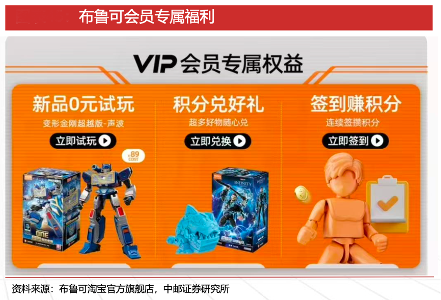 经典案例:根据布鲁可淘宝官方旗舰店、中邮证券研究所等综合资讯表明,布鲁可公司在各电商旗舰店针对不同会员等级提供福利,截至2024H1,公司各电商旗舰店拥有超过 880 万名粉丝。