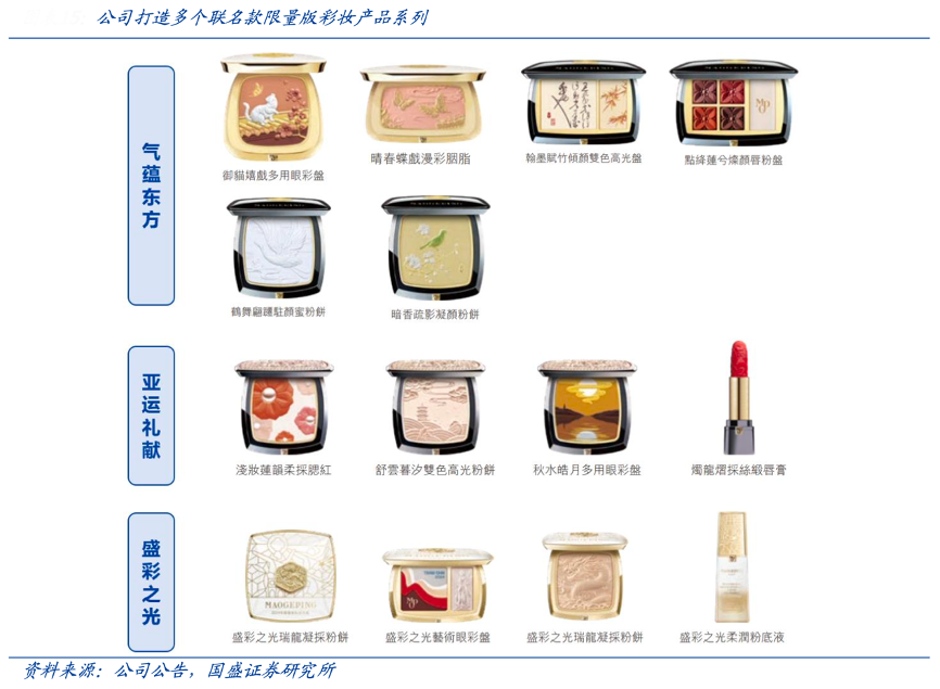 经典案例:根据公司公告、国盛证券研究所等综合资讯表明,MGP 品牌在彩妆条线推出限量版产品,融入传统文化及先进技术以提升使用体验和妆效,推出的代表性限量版 产品包括气蕴东方系列(与故宫文创联手打造,融合故宫博物馆的百年传承和传统东方 美学元素,目前已升级至第五代)、亚运礼献系列(结合杭州美景和亚运元素)等。