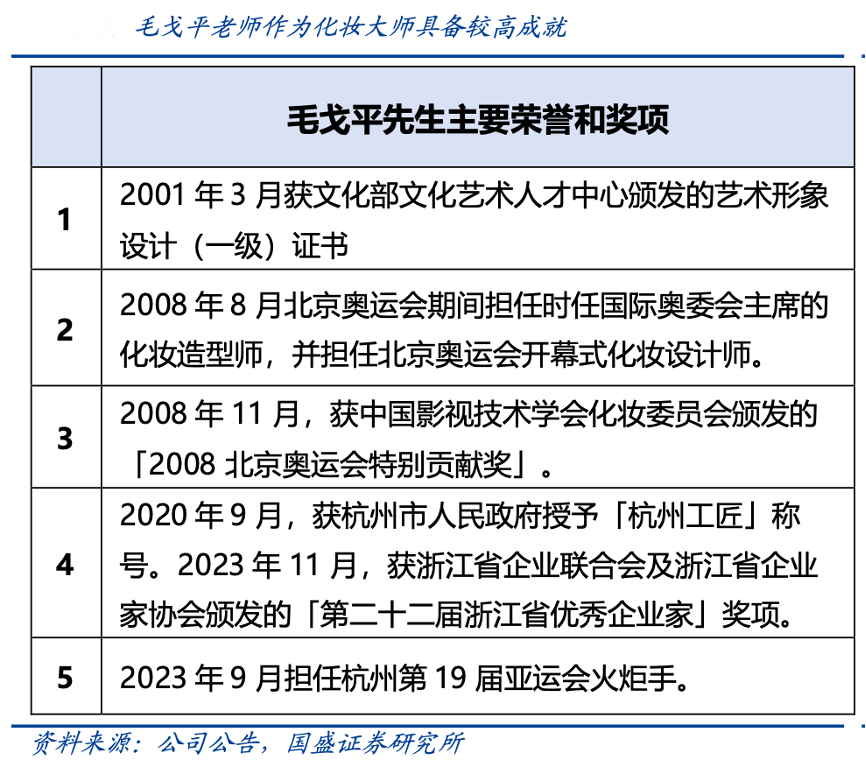 经典案例:根据公司公告、国盛证券研究所等综合资讯表明,国外大牌中不乏以创始人自身命名的知名品牌,如香奈儿、雅诗兰黛等,将品牌创始人自身的精神特质与品牌调性进行链接。毛戈平先生是中国著名的化妆艺术大师,有着 40 多年的从业经验,获得过诸多荣誉和奖项,曾四次获得中国电影电视技术学会化妆委员会颁发的化妆金像奖。