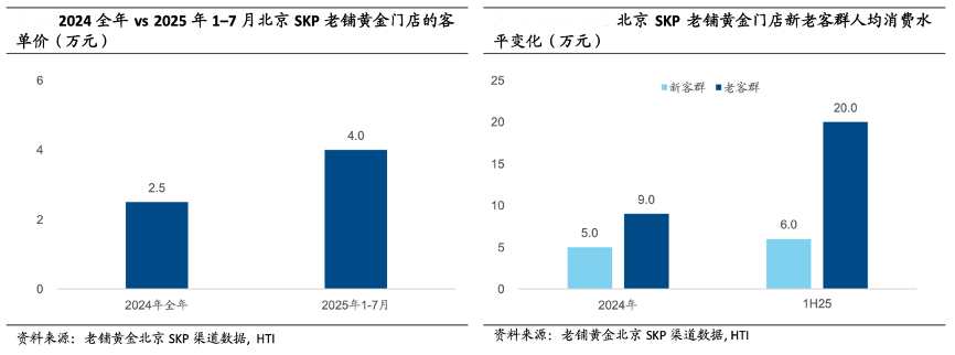 经典案例:根据老铺黄金北京SKP渠道数据、HTI等综合资讯表明,老铺黄金采取的“一口价”定价模式 弱化了产品价格与黄金克价的直接关联,分客群来看,2024 年北京 SKP 老铺门店新客人均消费约 5 万元,老客约 9 万元;2025 年 1–7 月新客人均消费提升至 6 万元,老客则跃升至 20 万元以上,反映出核心高净值客群复购金额显著攀升、消费深度持续加大。