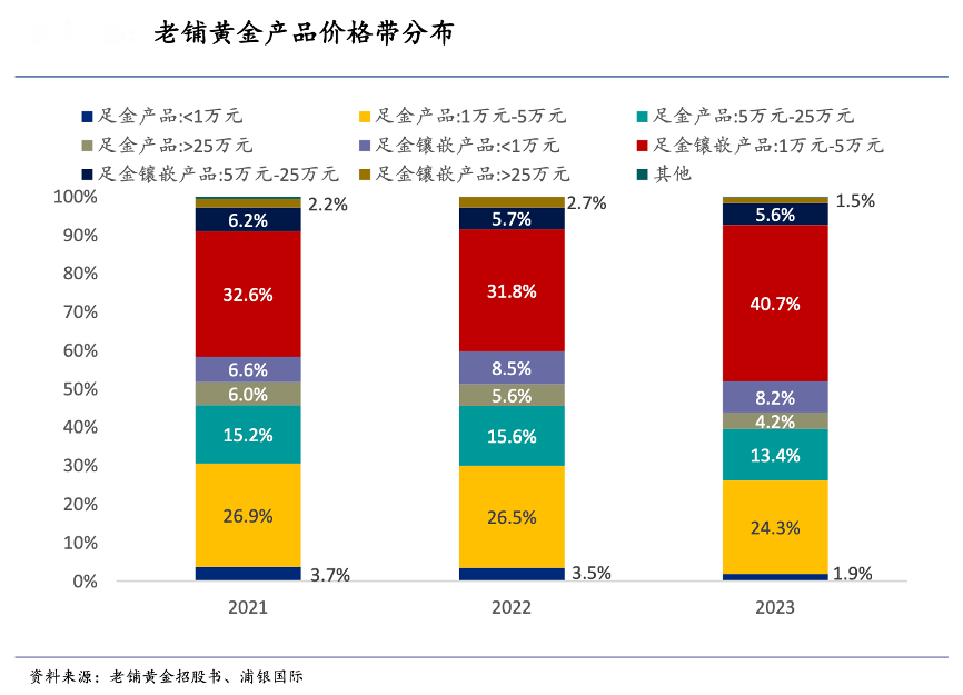 经典案例:根据老铺黄金招股书、浦银国际等综合资讯表明,2023 年,客单价在 5 万-25 万元的产品占老铺收入的 19%,而客单价在 1 万 -5 万元的产品占老铺收入的 65.1%。老铺的高客单价使其与大众黄金珠宝市场形成差异化的同时,也使其直接对标国际知名奢侈品珠宝品牌。