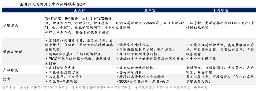 经典案例:根据圣贝拉母婴中心官方小红书帐号、茉莉智慧母婴护理中心小红薯书官方帐号、深圳爱帝宫月子中心小红书官方帐号、华泰研究等综合资讯表明,圣贝拉在完成场景与人员重塑后,服务落地作为供 应链重塑的最终环节,其标准化程度直接决定体验质量。其目前所有月子中心均全面部署该体系,覆盖业务全流程——包括分工机制、母婴护理程序及营销服务等,确保服务质量的一致性。以圣贝拉为例,其采用 24 小时 1V1 专护 保险级护理,配备 9V1 服务团队,精细化和专业化程度显著优于传统护理模式。