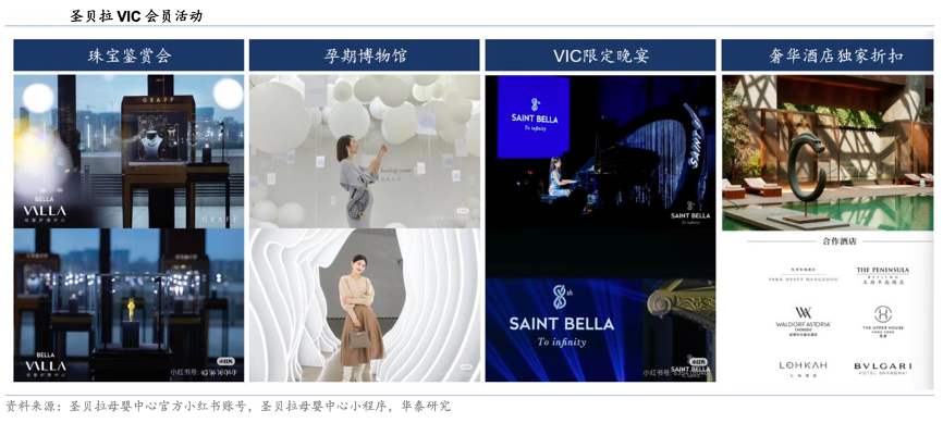 经典案例:根据圣贝拉母婴中心官方小红书帐号、圣贝拉母婴中心小程序、华泰研究等综合资讯表明,圣贝拉为留存客户并激发客户忠诚度,其为客户提供独家及限量版奢侈产品和服务,包括品牌联名产品、联合举办展览活动、奢侈品和护肤品的私人销售活动等。同时组织独家会员私人活动,例如私人音 乐会、艺术活动及与名人的社交聚会。
