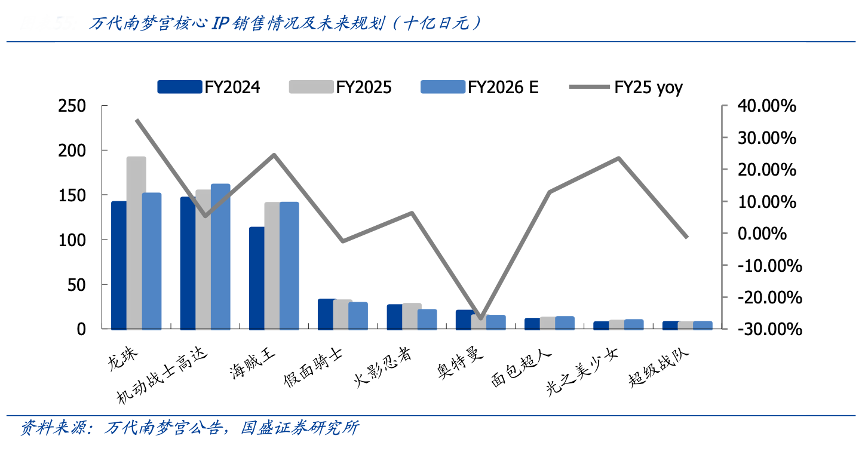 经典案例:根据万代南梦宫官网、国盛证券研究所等综合资讯表明,万代 FY2025.3 中 期数据显示,公司整体 IP 销售由头部三大 IP 主导,增长趋势显著,其中《龙珠》FY2025.3 集团销售达 1906 亿日元,同比增长 35.56%,体现 IP 在多业态并行下的强内容带动力。