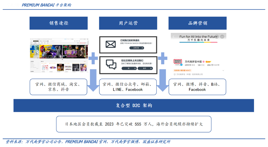 经典案例:根据万代南梦宫公司公告、PREMIUM BANDAI官网、万代南梦宫微博、国盛证券研究所等综合资讯表明,PREMIUM BANDAI 已被确立为万代集团旗下核心的官方电商平台,其日本 地区会员数截至 2023 年已突破 555 万人。该平台采取预约制销售机制,控制库存风险,并配合数字化直达手段实现 IP 与用户的深度绑定。