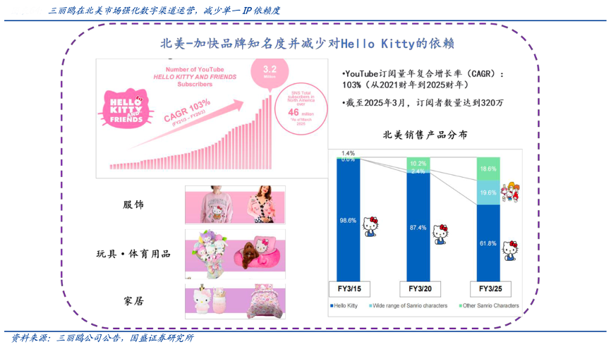 经典案例:根据三丽鸥公司公告、国盛证券研究所等综合资讯表明,在北美市场,三丽鸥通过强化数字渠道运营来提升品牌知名度,并逐步减少对Hello Kitty 单一 IP 的依赖。公司利用 YouTube 等社交媒体平台实现了快速增长,从 FY21/3 到 FY25/3 期间,Hello Kitty 及其朋友频道的订阅者复合年增长率高达 103%,截至 2025 年 3 月 SNS 总订阅者数已达 4600 万。