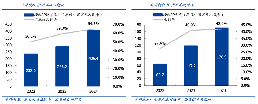 经典案例:根据乐自天成招股书、国盛证券研究所等综合资讯表明,乐自天成截至 2024 年 12 月 31 日,公司拥有 80 个国际 知名授权 IP(“ 包括蜡笔小新、猫和鼠等等经作作品),通过"爆品孵化公式"(“ IP 核心价值 提炼与二次创作→用户群分层→产品形态适配),结合强大的产品设计开发能力和多元化产品线,与 IP 版权方及授权方建立了深度绑定、互利共赢的长期合作关系。截至 2025 年 5 月 19 日,基于授权 IP 开发的在售 SKU 已突破 1400 个,展现出强大的商业化 运营能力。