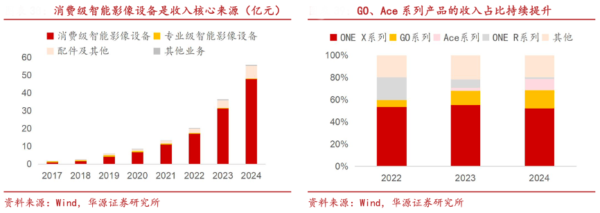 经典案例:根据wind、华源证券研究所等综合资讯表明,影石从全景相机到运动相机,产品矩阵逐步丰富。2024 年消费级智能影像产品收入达 47.89 亿元,同比增长 52.9%,贡献 85.9%的营收。具体来看,2024 年主力产品 ONE X 系列全景 运动相机占消费级收入的 60.9%。