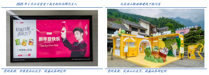 经典案例:根据甘源食品公众号、武功山公众号、国盛证券研究所等综合资讯表明,2025年1月甘源公司官宣丁禹兮担任品牌代言人,春节期间定制代言人礼盒,搭配赠送明星独家周边。同时开展一系列品宣活动,线下联合老婆 大人打造定制陈列,组织主题门店打卡活动。此外借助萍乡旅游优势,与武功山联名搭建线下快闪店,打卡赠送冰激凌,并沿线投放宣传物料,实现吃喝玩乐巧妙互动。