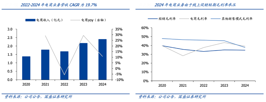 经典案例:根据公司公告、国盛证券研究所等综合资讯表明,甘源食品公司 2014 年上线天猫旗舰店,此后陆续登陆京东、拼多多等传统电商以及抖音、快手等直播电商。伴随直播电商快速发展、形成对传统电商份额的抢占,甘源加大对达播、自播、短视频的推广力度。2024 年 甘源电商业务实现营收 2.4 亿元,同比+10.7%。