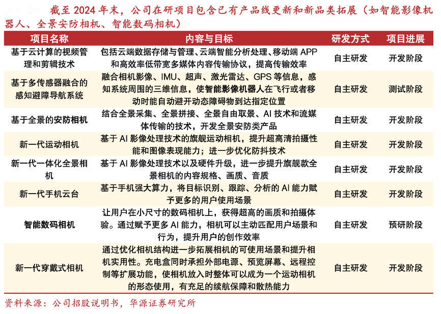 经典案例:根据公司招股说明书、华源证券研究所等综合资讯表明,目前影石公司在研项目充足,凭借对用户需求的敏锐洞察,以及技术和供应链的多年积累,公司产品矩阵有望不断丰富,逐步打开成长天花板。