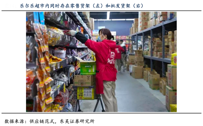 经典案例:根据供应链范式、东吴证券研究所等综合资讯表明,乐尔乐目前采用批发和零售结合的方式运营。其零售模型服务 C 端客户,批发模式服务 B 端客户(包括夫妻 老婆店、社区超市的经营者)。门店内可以同时经营两种模式,在经营场地内放置两种货 架,一种是 3 层的批发货架,摆放整箱未拆封的商品,另一种是 7 层的零售货架,摆放 用于零售的单件商品,两种货架上的商品种类没有差别。C 端客户和 B 端客户可以在两 种货架中挑选并购买同样的商品。