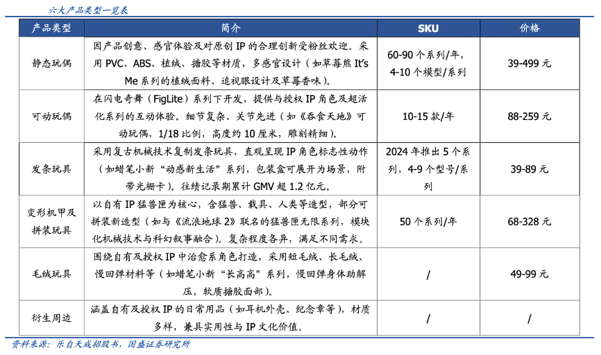 经典案例:根据乐自天成招股书、国盛证券研究所等综合资讯表明,乐自天成公司依托自有及授权 IP 资源,打造了涵盖六大品类的玩具产品体系。52TOYS 品牌通过系统化产品布局,已形成包括静态玩偶、可动玩偶、发条玩具、变形机甲及拼装玩具、毛绒玩具、衍生周边在内的完整产品矩阵。