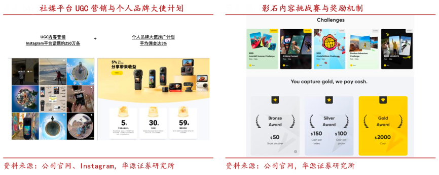 经典案例:根据公司官网、Instagram、华源证券研究所等综合资讯表明,影石多元激励机制助力营销裂变,推动用户从消费者向品牌共创者转化。如“UGC 内容挑战赛”,定期限时发起“高光时刻挑战赛”、“世界探险大玩家”等主题挑战,优秀作品可获得平台曝光、现金奖励或新品试用资格。