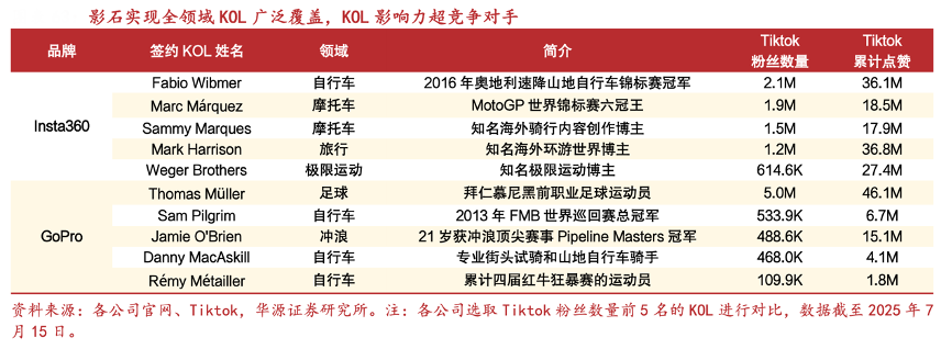 经典案例:根据各公司官网、Tiktok、华源证券研究所等综合资讯表明,影石实现全领域 KOL 广泛覆盖,KOL影响力超竞争对手。