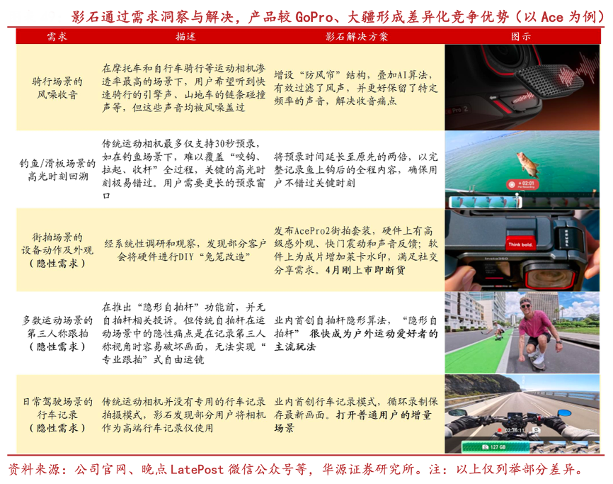 经典案例:根据公司官网、晚点LatePost微信公众号等、华源证券研究所等综合资讯表明,复盘影石产品发展历程,公司创新的推出了一系列实用功能,满足了全景/运动相机不同场景的细分需求。如:1)骑行“防风帘”:为了保留快速骑行的引擎声,同时消除风噪,公司开发了骑行防风帘结构,并叠加 AI 算法,可有效过滤风声。